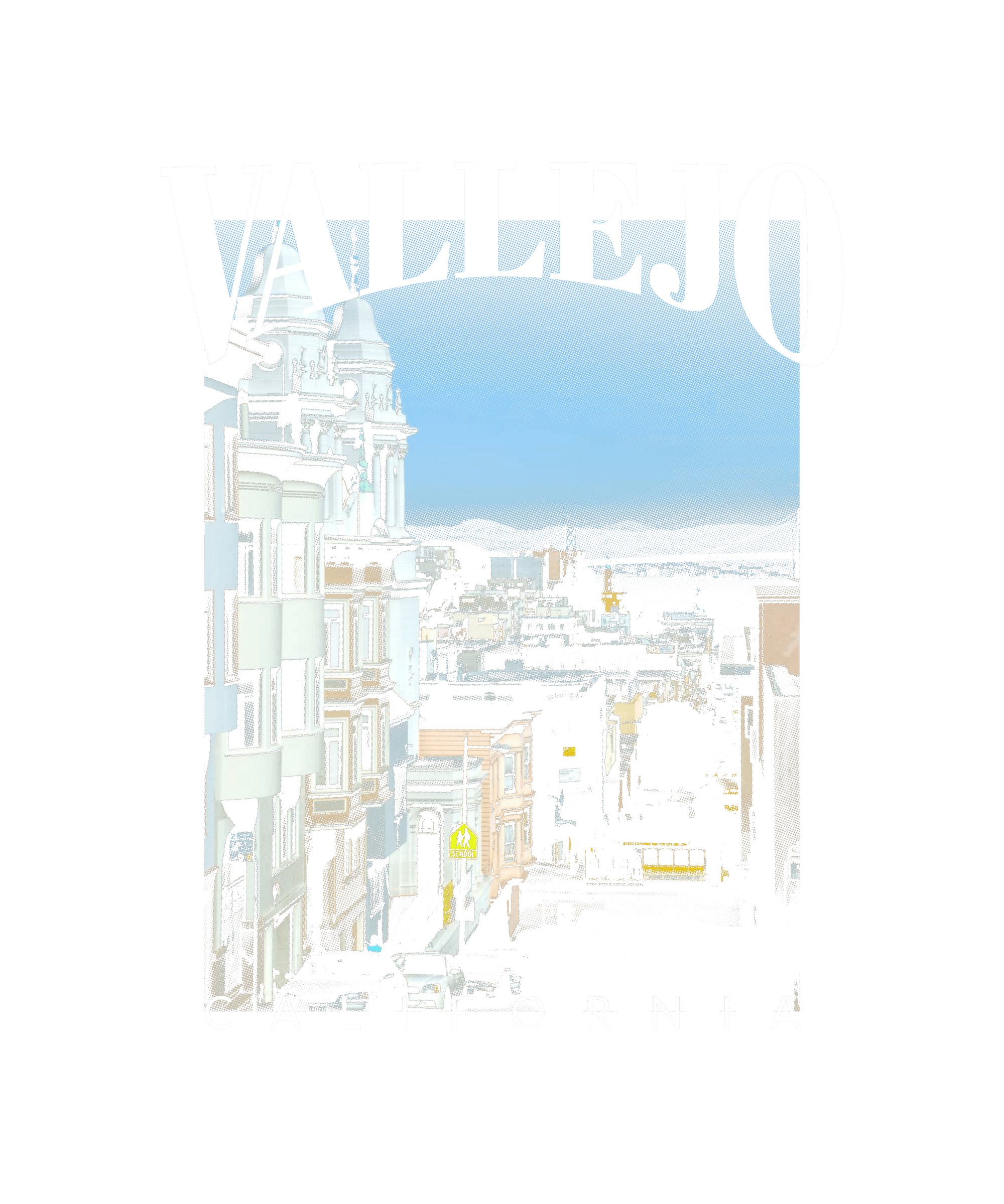 Showcasing the scenic charm of Northern California, this Vallejo city print captures the hillside streets, classic architecture, and views stretching toward the Bay. The vintage halftone texture and bold typography give the design a timeless West Coast feel, blending urban character with coastal atmosphere. A perfect piece for anyone connected to Vallejo or inspired by the beauty of Bay Area cities.