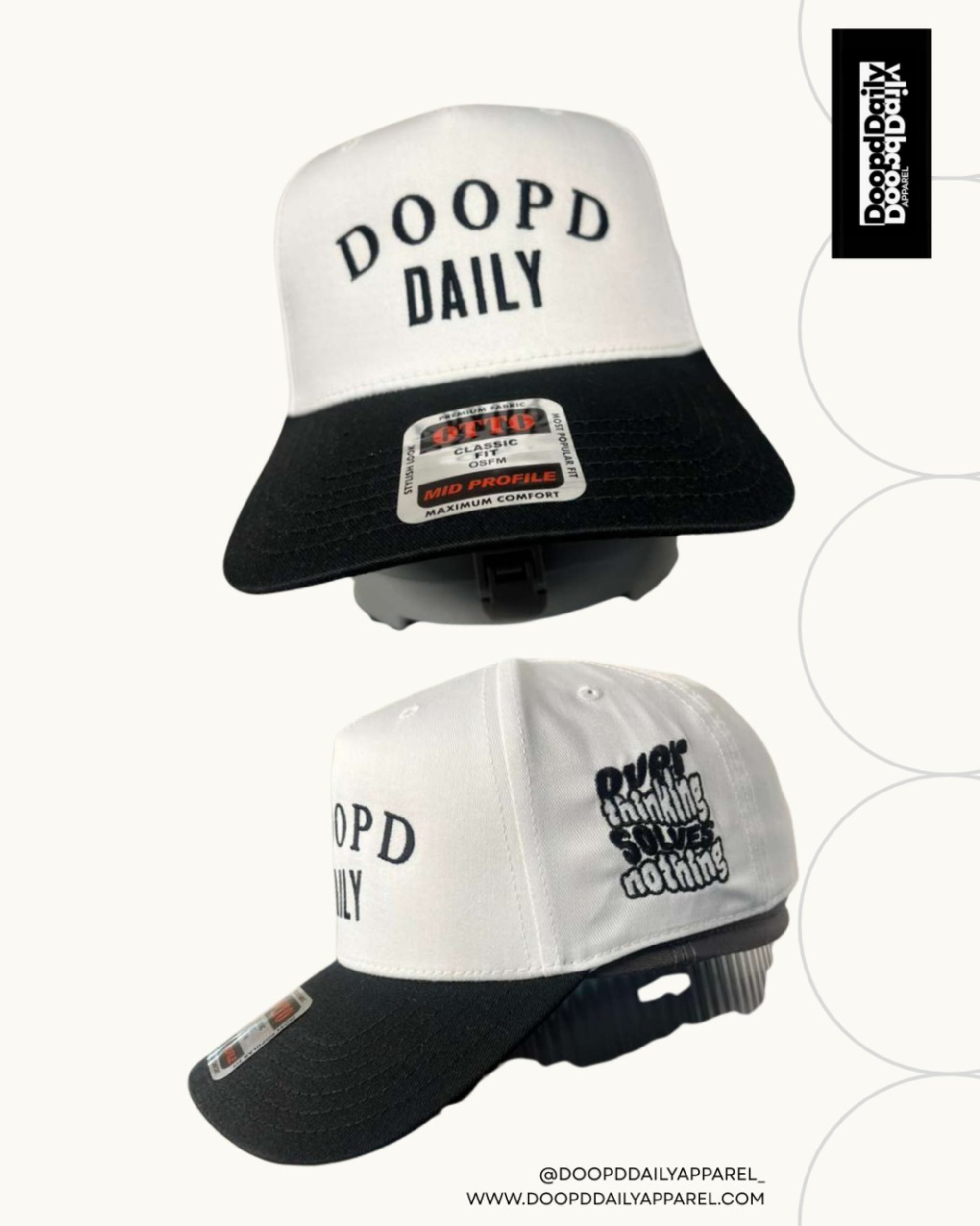 DOOPD DAILY LOGO STITCHED UP FRONT! OVER THINKING SOLVES NOTHING STICHTED ON THE SIDE!